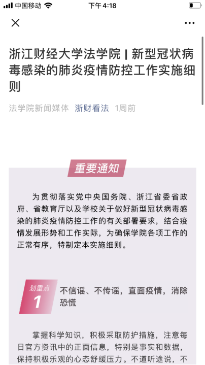 微信公众号“浙财看法”定期推送,宣传科学防控知识,引导师生理性认识疫情,科学做好防护。对排摸到的医学隔离人员以及有疫区旅行史、接触史等情况的师生,做到实时登记入库,各党支部书记更是每天一对一进行联系跟进。