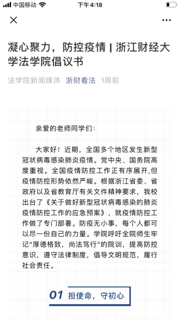全体师生发起名为“凝心聚力,防控疫情”的倡议书,呼吁全院师生“担使命、守初心、尚律法、弘公德、览群书、强修养”,提高防控意识,遵守法律制度,倡导文明规范,履行社会责任。