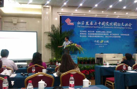 2012年9月13-14日,由浙江大学和上城区联合主办的“社区发展与中国实践”国际交流会在西子湖畔隆重举行。来自美国、加拿大、英国、澳大利亚、日本等国的10多位学者,和来自国内高校的30余位学者、18个区(县)市的社区建设部门负责人齐聚一堂,围绕国内外社区管理服务的理论、政策和实践进行了深入探讨。浙江省副省长陈加元、杭州市副市长戚哮虎,国家、省、市民政部门负责人及浙江大学有关领导出席会议。