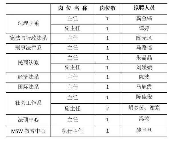 经个人自荐、组织推荐、资格审查、澳门六合彩开奖记录资料 组织选聘征求意见,党政联席会议讨论研究、党委会审定,拟聘以下人员至各系系主任、法硕中心主任、社会工作硕士(MSW)教育中心执行主任岗位。具体名单如下: